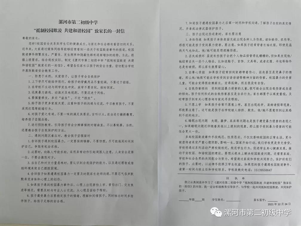 举办了校园防欺凌问卷调查;发放了《预防校园欺凌致家长的一封信》。