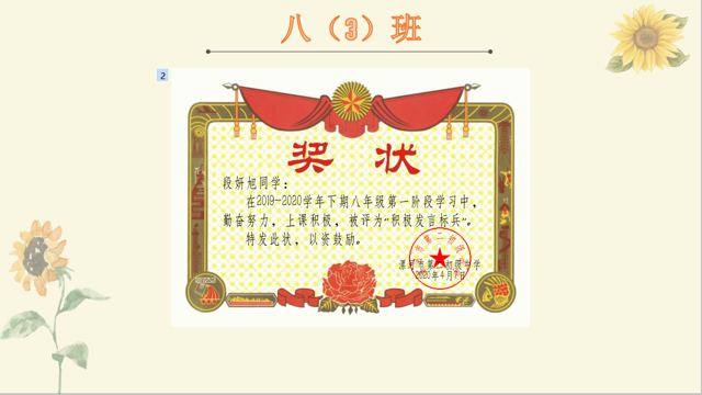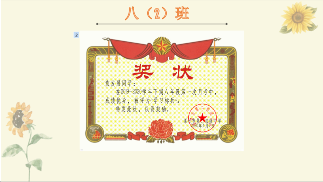 在本次检测中,涌现出了一批优秀学子,他们勤奋刻苦、成绩优异!特殊情况下,年级为直播课中积极发言、 作业认真 、 进步明显 、成绩突出的优秀学生制作了电子奖状,并在家长会上一一颁发,激励先进,鼓励后进。