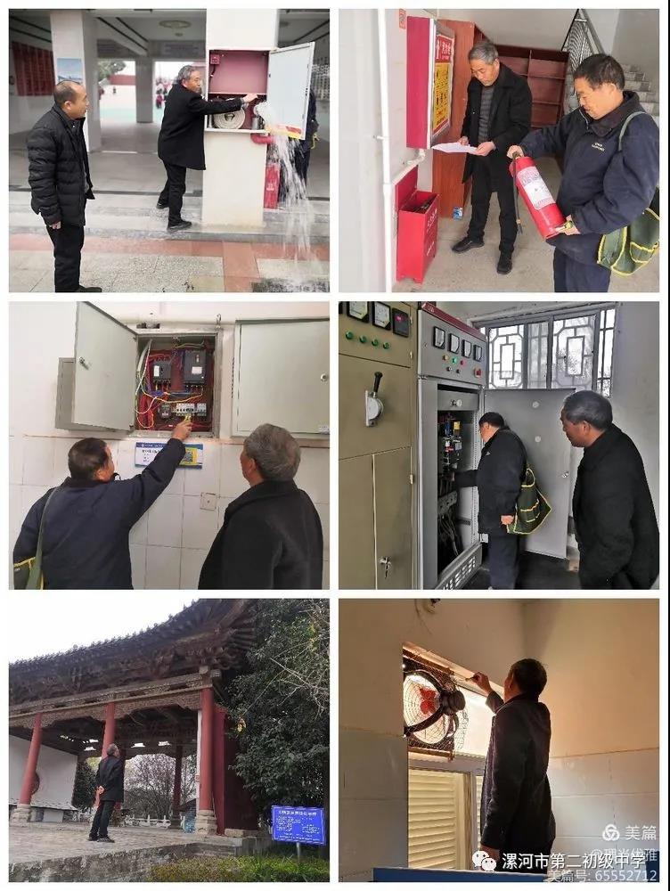 在副校长段彦召同志的带领下,工作人员认真对学校周边商店、学校的教室、办公室、道路、小广场的配电设施、消防栓、屋顶瓦片等开展了全方位的安全隐患排查工作,并对电线路开关、插座、漏电保护器进行拉网式安全检查,发现的老化或配置不合理的用电隐患以及其他安全隐患,提出整改意见并及时进行维修改造,确保学校安全无忧。