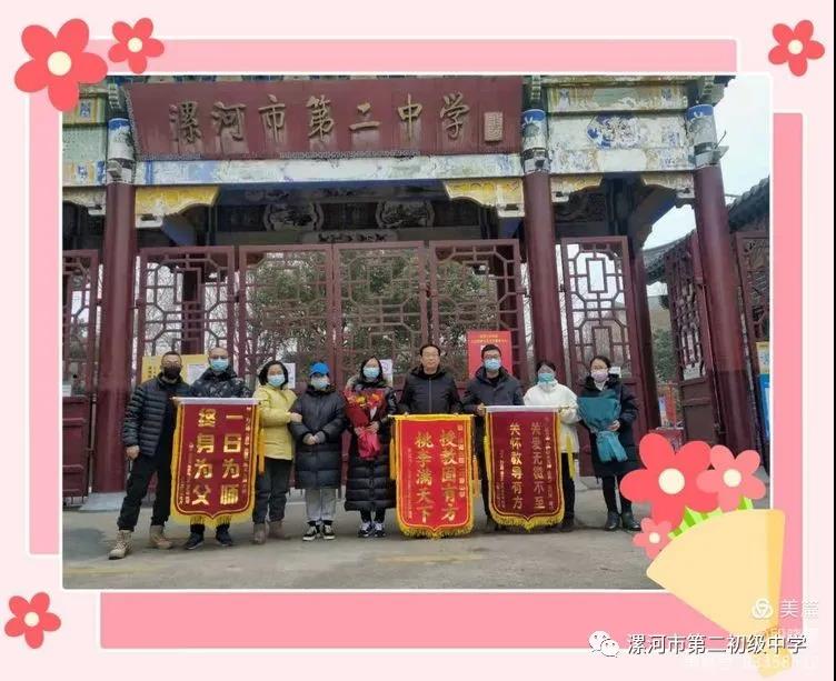 2022年1月10日上午,漯河二中的老师们如往日一样进行着紧张的期末复习,八五班班主任段晓果接到了家委会一名家长的电话,班级学生李芳菲家长、何一卓家长、刘澳林家长在学校门口等候,怀着感恩之心将绣有“授教固有方,桃李满天下” “一日为师,终身为父” “关爱无微不至,关怀教导有方”的三面锦旗送到学校,借此表达对学校培育成才的肯定以及对八五班所有任课老师的感激。