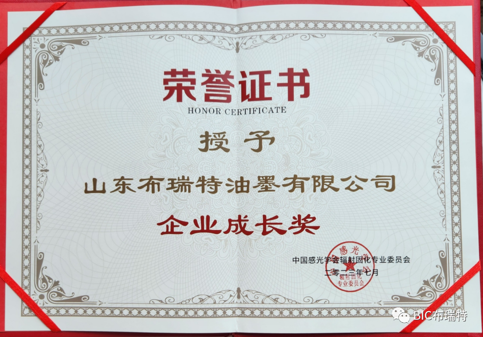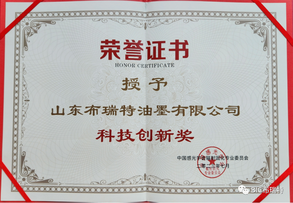 在此次大会,山东布瑞特油墨有限公司获得了中国感光学会辐射固化专业委员会成立三十周年表彰先进 “科技创新奖”、“企业进步奖” 的两项荣誉。