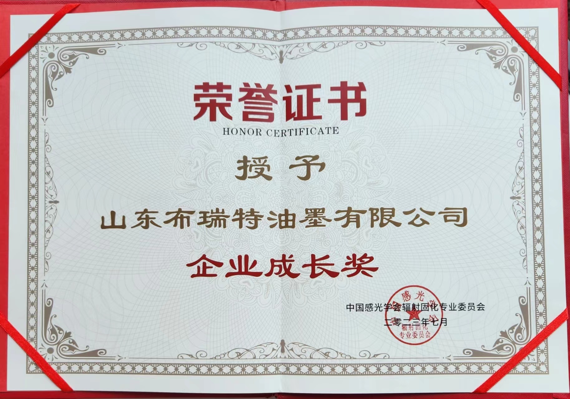 2023年7月,在中国感光学会辐射固化专业委员会成立30周年之际,山东布瑞特油墨有限公司(BIC 山东)被辐射固化专业委员会授予“科技创新奖”和“企业成长奖”。
